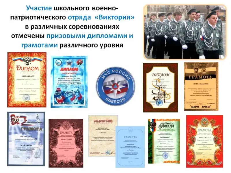 Участие школьного военно-патриотического отряда «Виктория» в различных соревнованиях отмечены призовыми дипломами и грамотами различного уровня