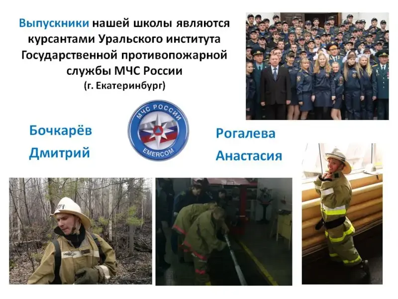 Выпускники нашей школы являются курсантами Уральского института Государственной противопожарной службы МЧС России (г. Екатеринбург).