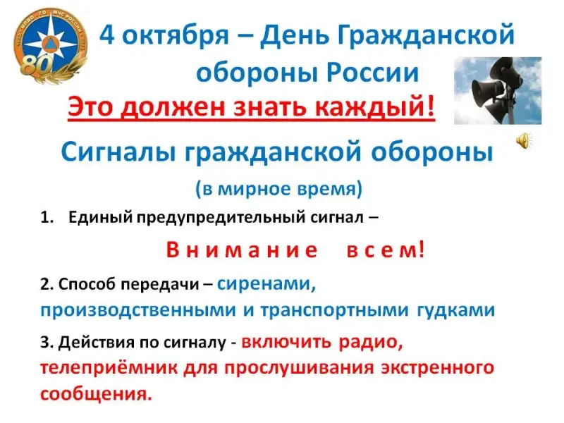 3. Действия по сигналу - включить радио, телеприёмник для прослушивания экстренного сообщения. (Прослушивание сигнала в записи Приложение 2)