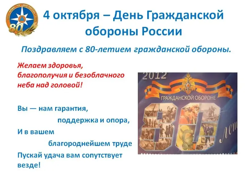 - Здравствуйте, ребята. 2012 год объявлен годом Гражданской обороны в России. Сегодняшний классный час посвящён 80-летию Гражданской обороны в России.