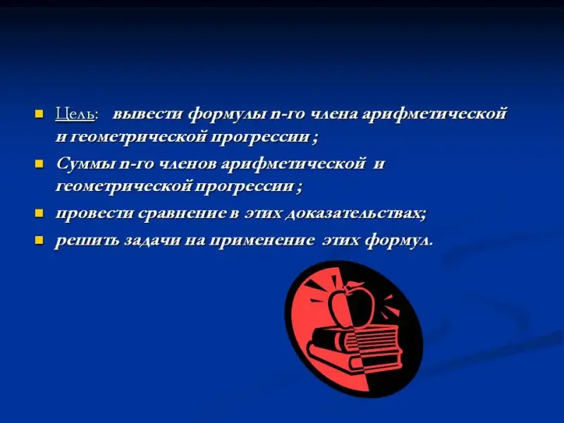 Цель: вывести формулы n-го члена арифметической и геометрической прогрессии и провести сравнение в этих доказательствах, решить задачи на применение этих формул.