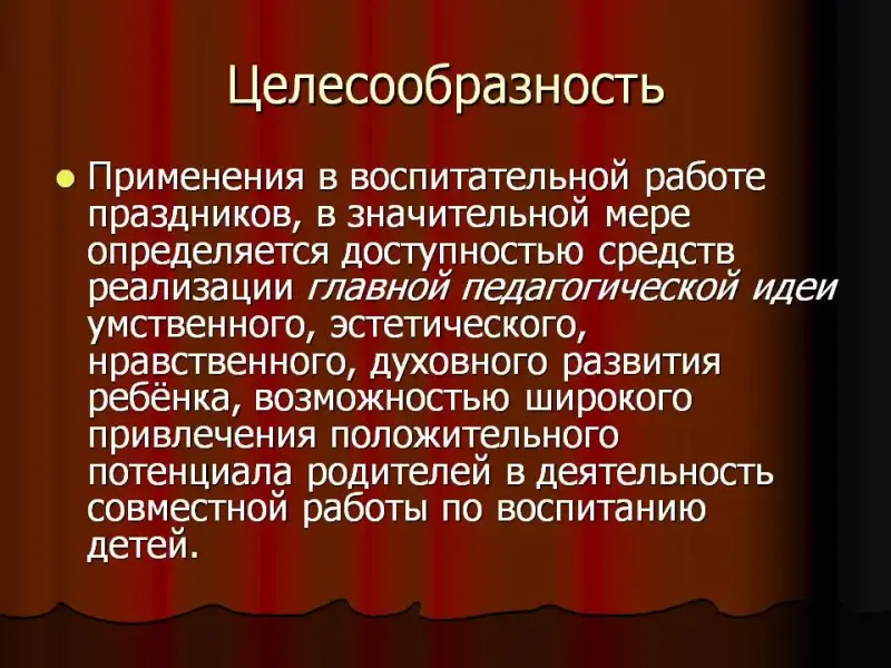 Практическая приемлемость и целесообразность применения в воспитательной работе праздников, в значительной мере определяется доступностью средств осуществления и творческой реализации главной педагогической идеи умственного, эстетического, нравственного, духовного развития ребёнка, возможностью широкого привлечения положительного потенциала родителей в деятельность совместной работы по воспитанию детей. В системе подготовки и проведения праздников, которая направлена на развитие личности ребёнка, его интеллектуального, творческого, духовного потенциала;