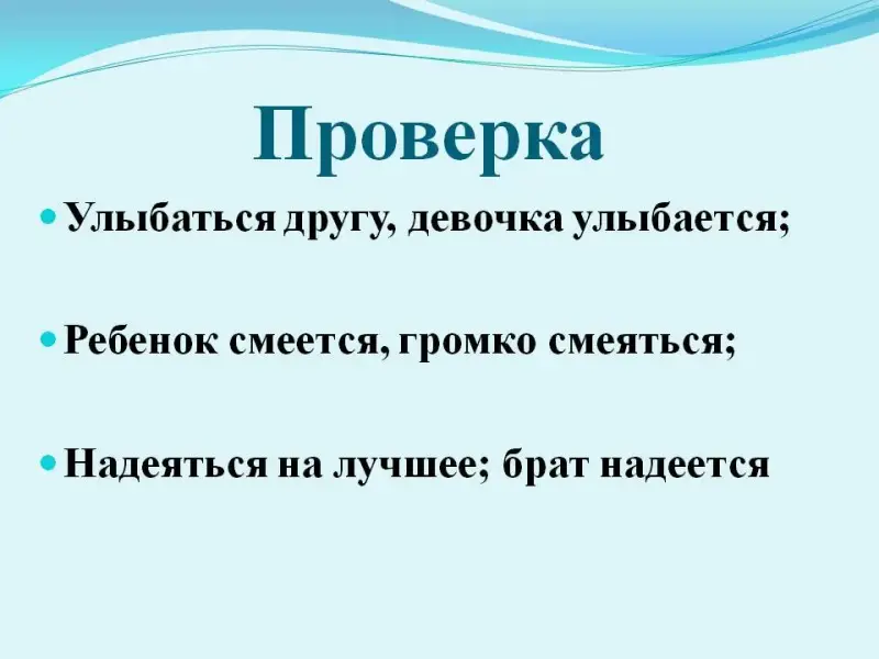 Улыбат..ся друг другу, девочка улыбает..ся; ребенок смеет..ся, громко смеят..ся; надеят..ся на лучшее, брат надет..ся.