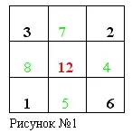 Вставить недостающие цифры, чтобы их сумма по вертикали и горизонтали была равна 12. Зеленым цветом выделены вставленные цифры.