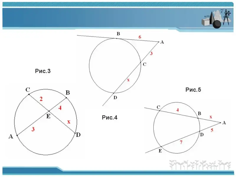 Ну, а теперь приступим к решению более серьезных задач. Вашему вниманию предлагается три блока: пересекающиеся хорды, касательная и секущая, две секущие. Подробным образом разберем решение по одной задачи из каждого блока.