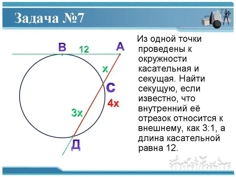 7. Из одной точки проведены к окружности касательная и секущая. Найти секущую, если известно, что внутренний её отрезок относится к внешнему, как 3:1, а длина касательной равна 12.