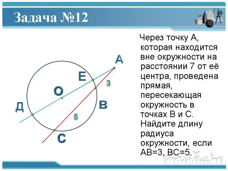 12. Через точку А, которая находится вне окружности на расстоянии 7 от её центра, проведен прямая, пересекающая окружность в точках В и С. Найдите длину радиуса окружности, если АВ=3, ВС=5.