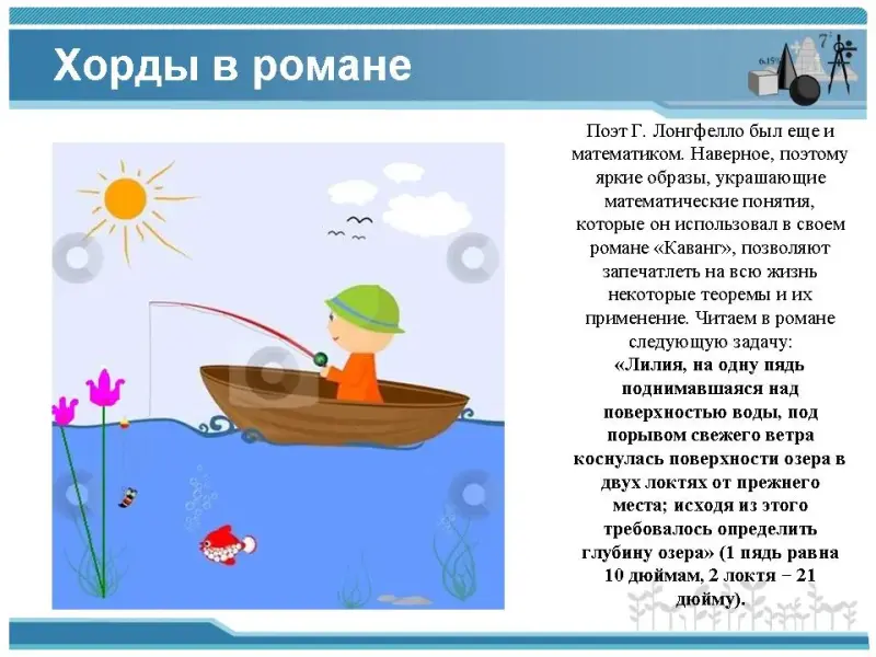 Поэт Г. Лонгфелло был еще и математиком. Наверное, поэтому яркие образы, украшающие математические понятия, которые он использовал в своем романе "Каванг", позволяют запечатлеть на всю жизнь некоторые теоремы и их применение. Читаем в романе следующую задачу: