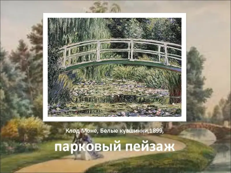 В парковом пейзаже изображают уголки природы, созданные для отдыха людей, где гармонично сочетаются природные формы с декоративной скульптурой и архитектурой.