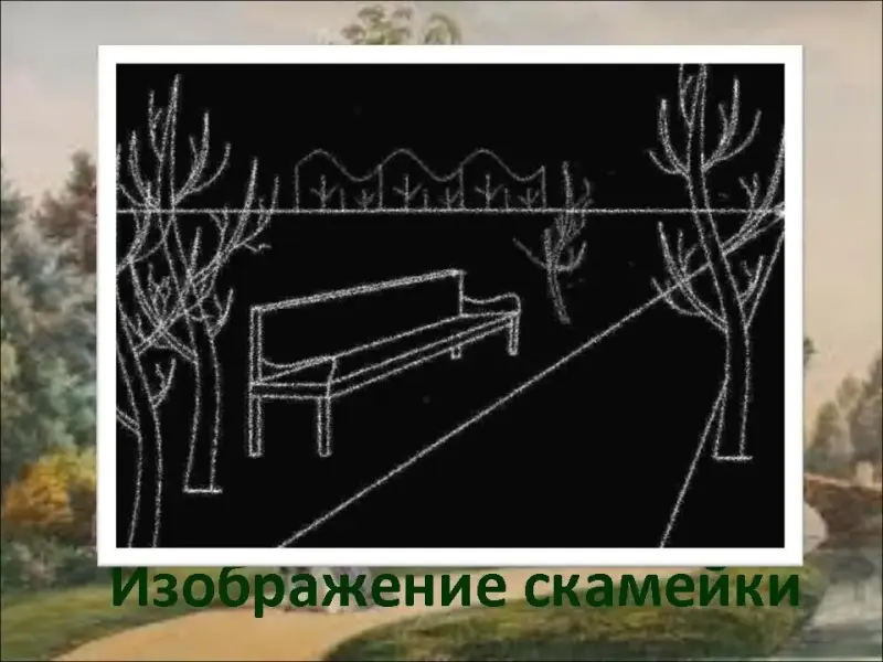 - Парковый пейзаж может включать изображения малых архитектурных форм. К ним относятся: скамейки,