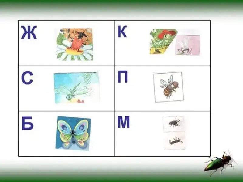 Назовите первый звук слова, покажите к какой нужной букве мы поместим фото насекомого и назовите этого насекомого.