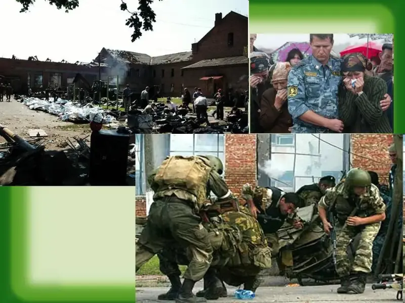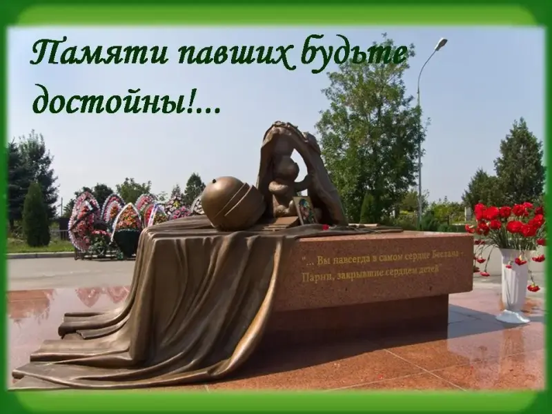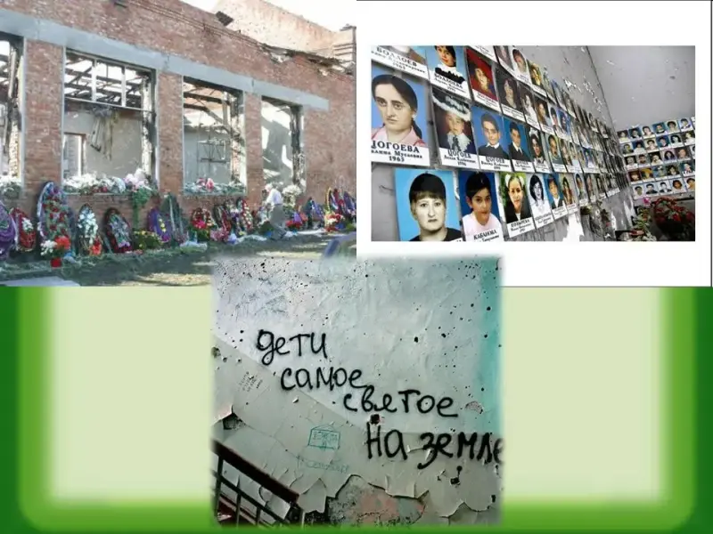 Ведущий 2 В результате 2-х дневной осады и последовавшим штурмом здания школы, захваченной террористами, погибло 334 человека, в том числе 186 детей.