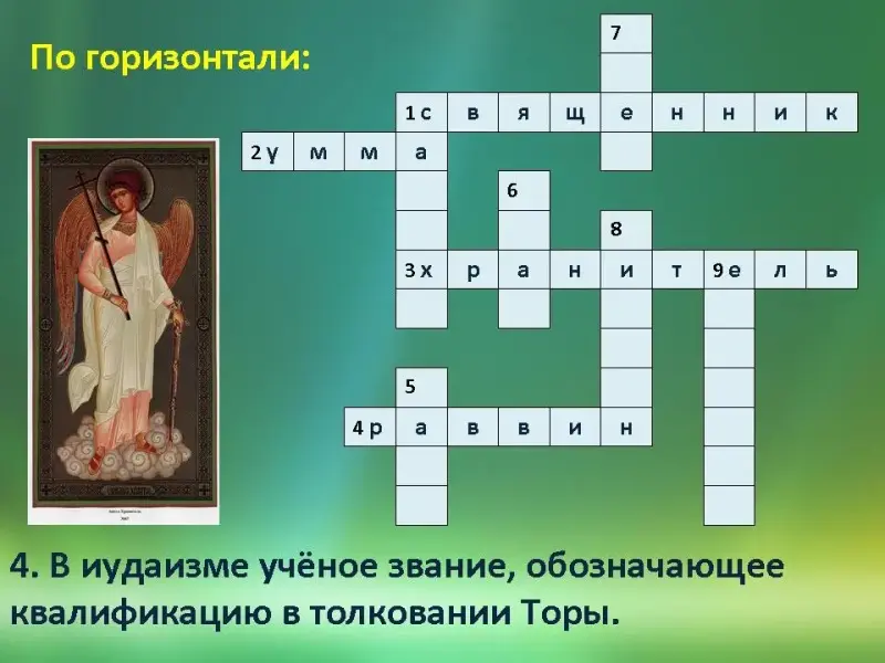 Ответы: 1. Священник. 2. Умма. 3. Хранитель. 4. Раввин.