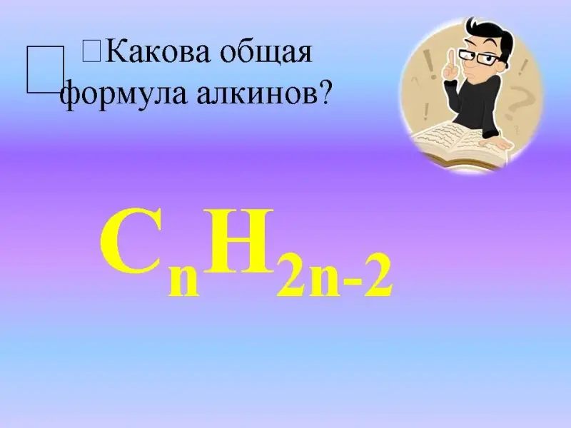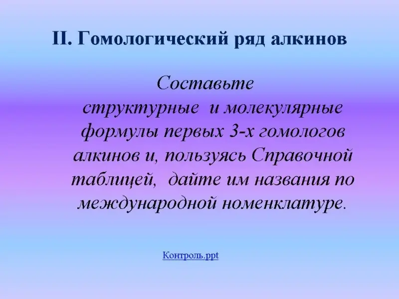 | Общая формула гомологического ряда алкинов (выводит учащийся у доски). Контроль ответа (по щелку комп.мышки) | Слайд 5 | |