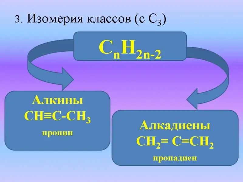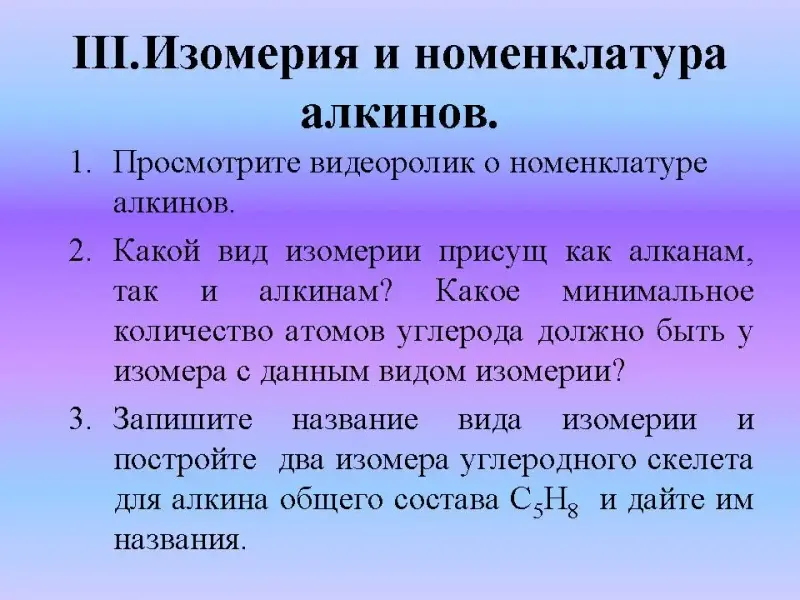 4) актуализировать понятие об изомерии углеродного скелета и положения кратной связи в молекулах алкинов, познакомить с изомерией классов;