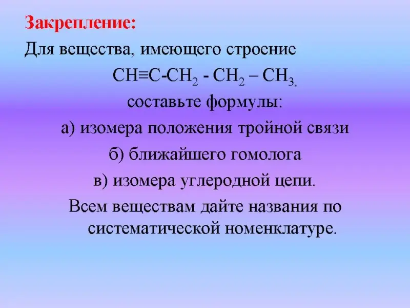 Закрепление (разбор одного из вариантов вопроса контрольной работы): для вещества СН?С-СН2-СН2-СН3