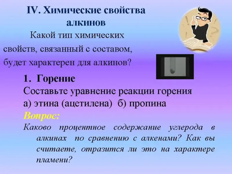 | 2. Химические свойства алкинов. Способы получения. | Учитель оглашает тему, цели и задачи урока. | Слайд 11 |