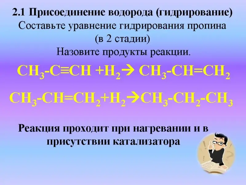 | Гидрирование. Работа учащегося у доски по составлению уравнений двух стадий гидрирования пропина. Контроль ответа (учитель открывает на слайде) | Слайд 13 | |