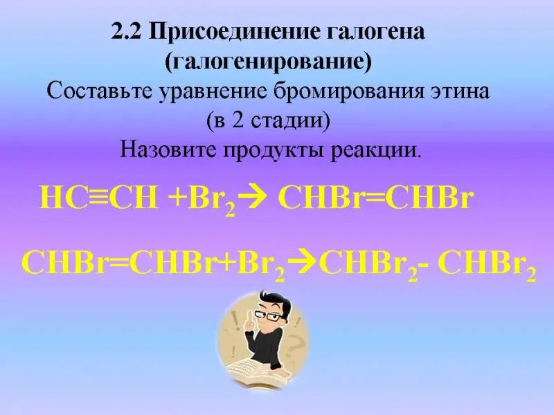 | Галогенирование. Работа учащегося у доски по составлению уравнений двух стадий бромирования этина. Контроль ответа (учитель открывает на слайде). | Слайд 14 | |
