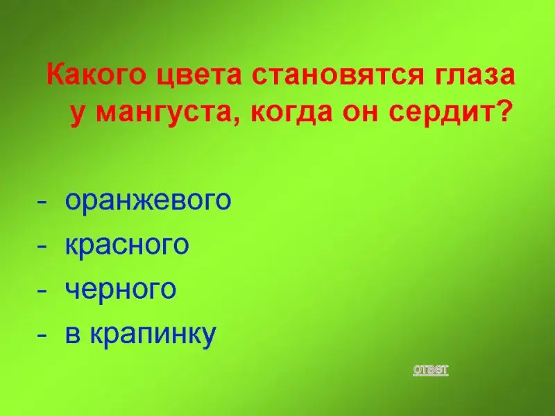 100 баллов: Какого цвета становятся глаза у мангуста, когда он сердит?