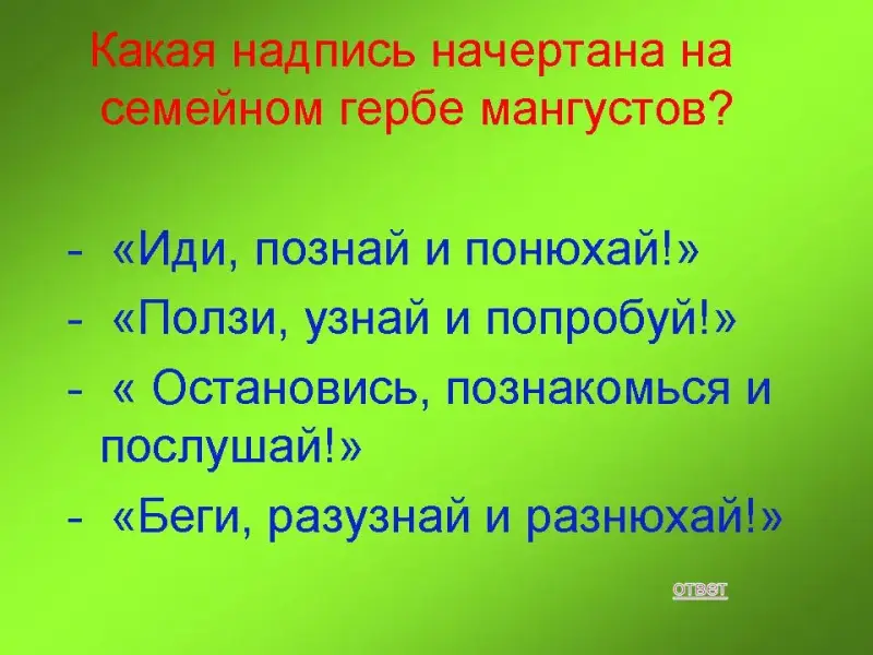 150 баллов: Какая надпись начертана на семейном гербе мангустов?