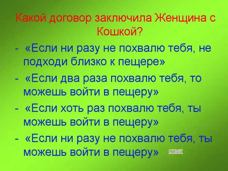 50 баллов: Какой договор заключила Женщина с Кошкой?