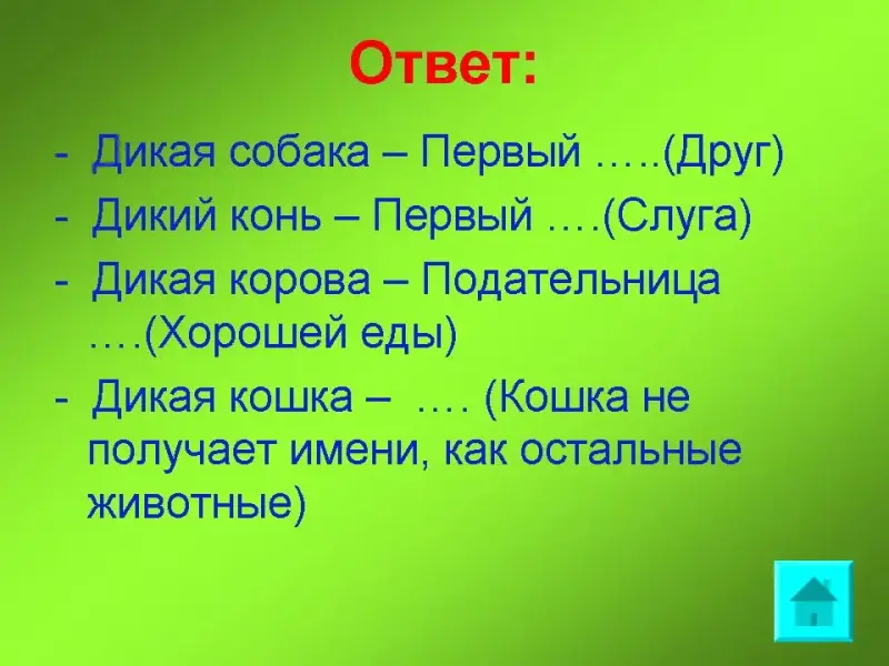 - Дикая кошка - … (Кошка не получает имени, как остальные животные)