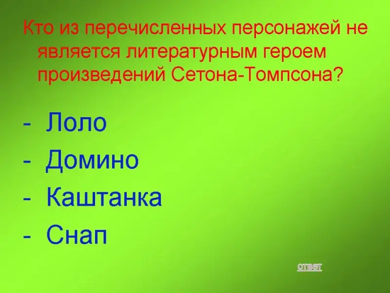 150 баллов: Кто из перечисленных персонажей не является литературным героем произведений Сетона-Томпсона?