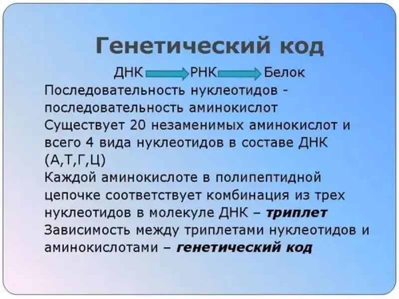 Суть генетического кода заключается в том, что последовательность расположения нуклеотидов в ДНК и в иРНК определяет последовательность расположения аминокислот в белках. Носителем генетической информации является ДНК, но так как непосредственное участие в синтезе белка принимает иРНК, то генетический код записан на "языке" РНК.