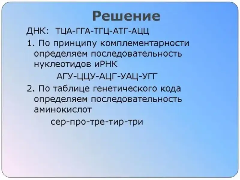ДНК: ТЦА-ГГА-ТГЦ-АТГ-АЦЦ