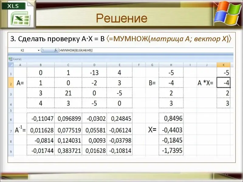 Откройте новую книгу Excel и решим вместе систему представленную на экране. Слайды 18-21.