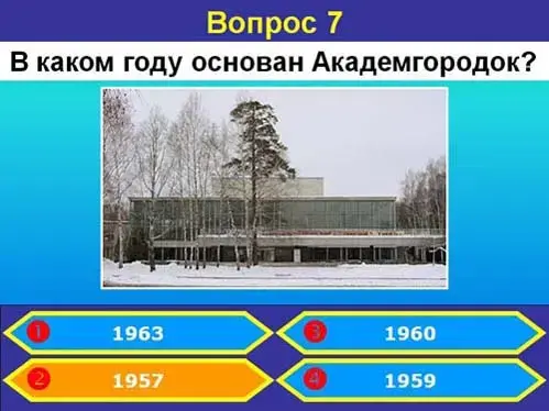 Вопрос 7: В каком году основан Новосибирский Академгородок? 1963, 1957, 1960 или 1959. Слайд презентации (Рисунок 3).