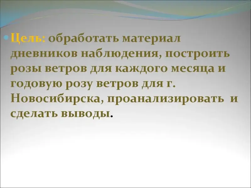 Цель: обработать материал дневников наблюдения, построить розы ветров для каждого месяца и годовую розу ветров для г. Новосибирска, проанализировать и сделать выводы.