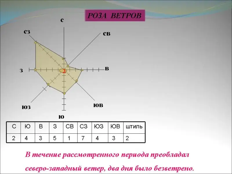 Роза ветров, построенная по реальным данным наблюдений, позволяет по длине лучей построенного многоугольника выявить направление господствующего, или преобладающего ветра, со стороны которого чаще всего приходит воздушный поток в данную местность.
