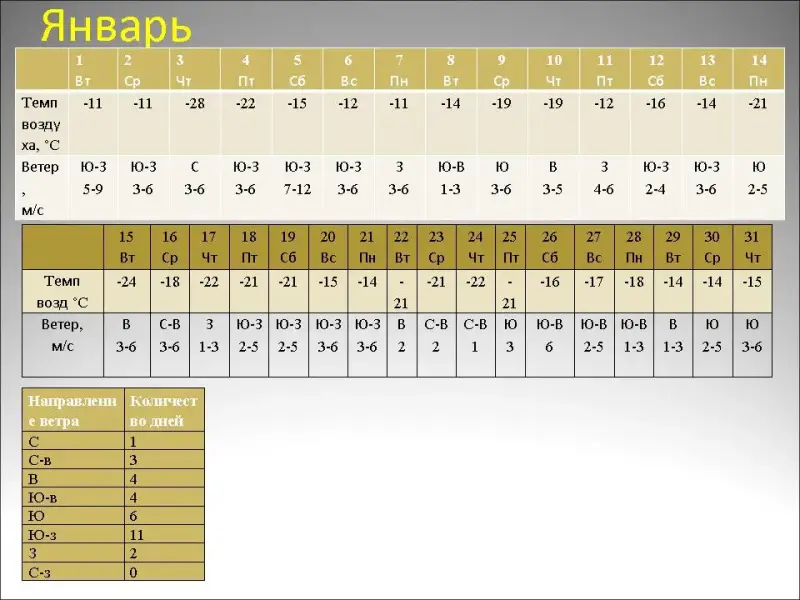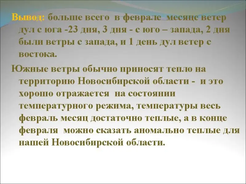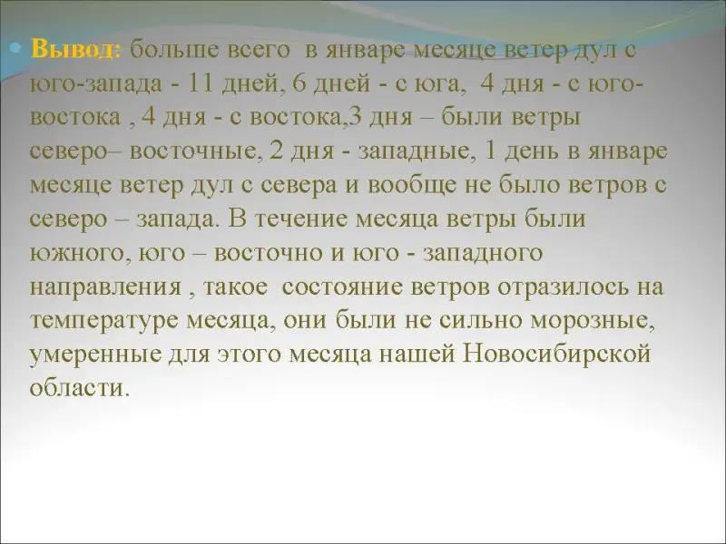 Вывод: больше всего в январе месяце ветер дул с юго-запада - 11 дней, 6 дней - с юга, 4 дня - с юго-востока , 4 дня - с востока,3 дня - были ветры северо- восточные, 2 дня - западные, 1 день в январе месяце ветер дул с севера и вообще не было ветров с северо - запада. В течение месяца ветры были южного, юго - восточно и юго - западного направления , такое состояние ветров отразилось на температуре месяца, они были не сильно морозные, умеренные для этого месяца нашей Новосибирской области.