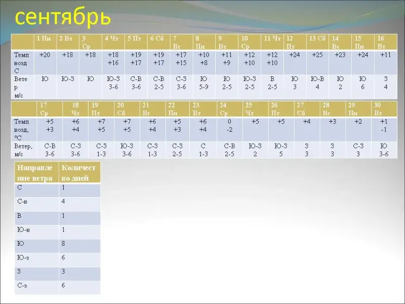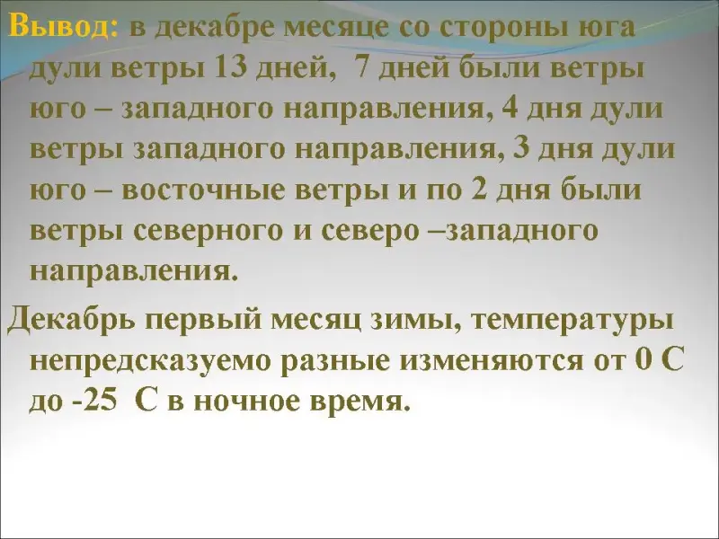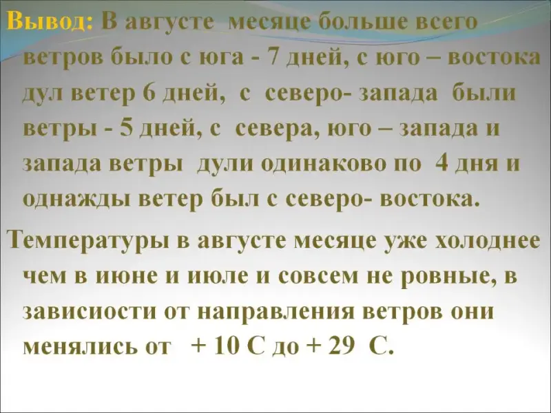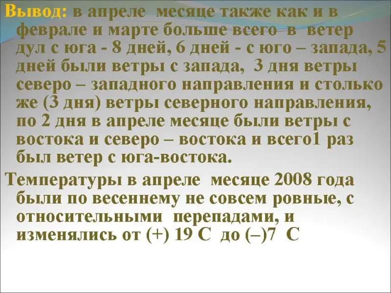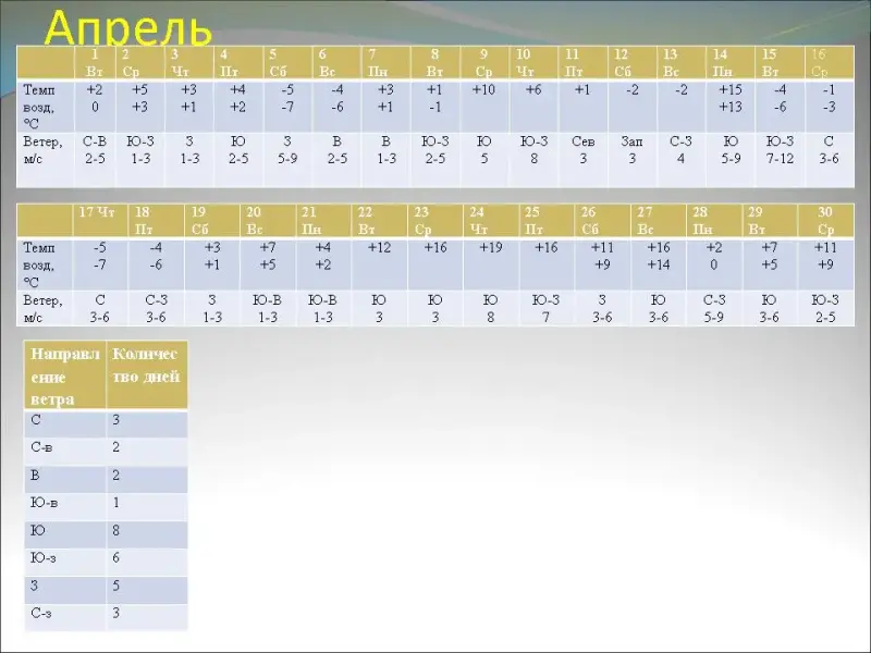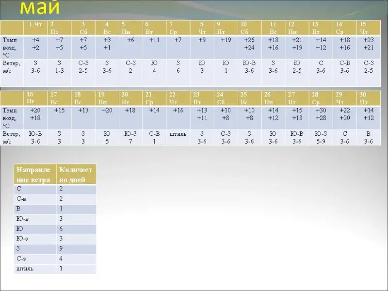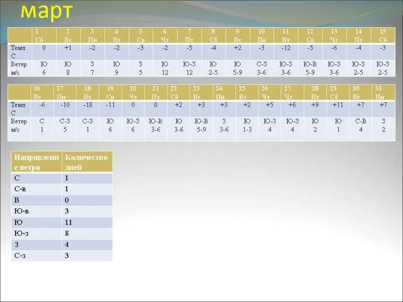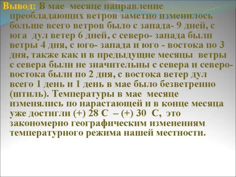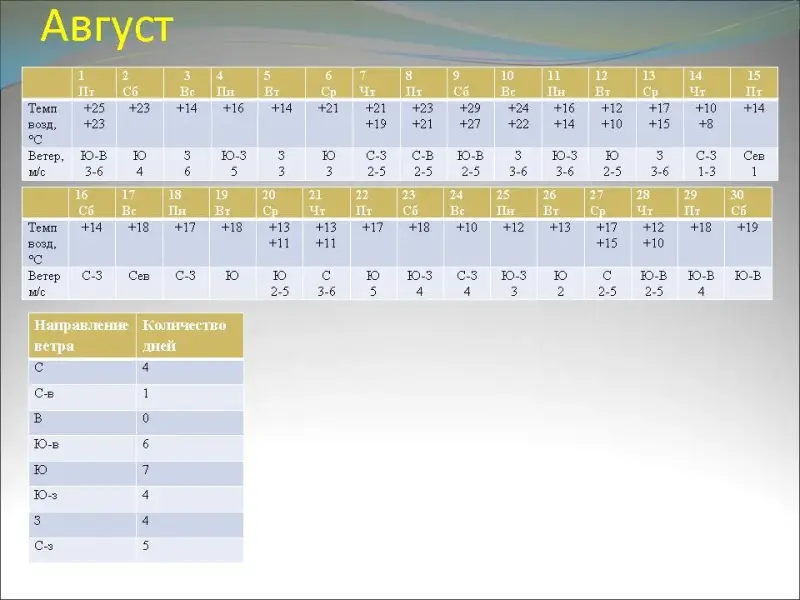 5. Оформите 3 слайда для общей презентации, по вашему месяцу (1 слайд - таблица данных дневника наблюдения, 2-й слайд - диаграмма «Роза ветров», 3 слайд - вывод), (Презентация, слайд 7-39)