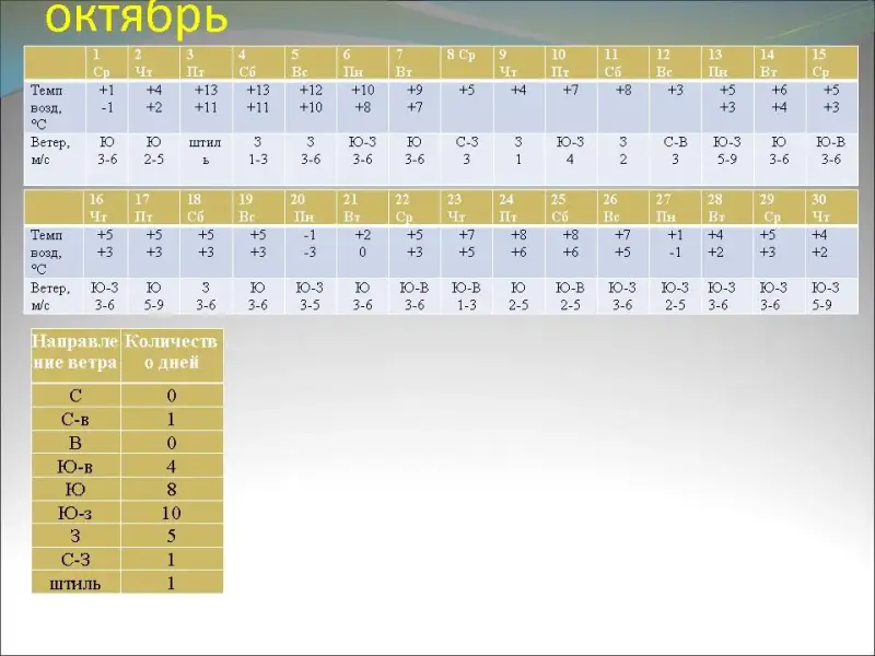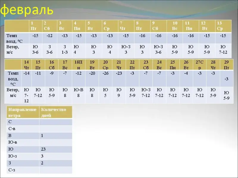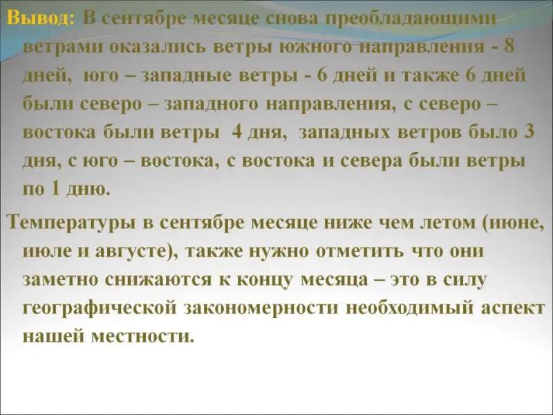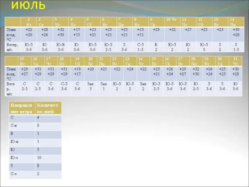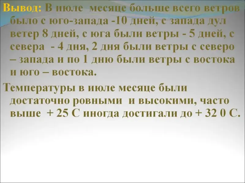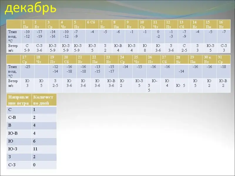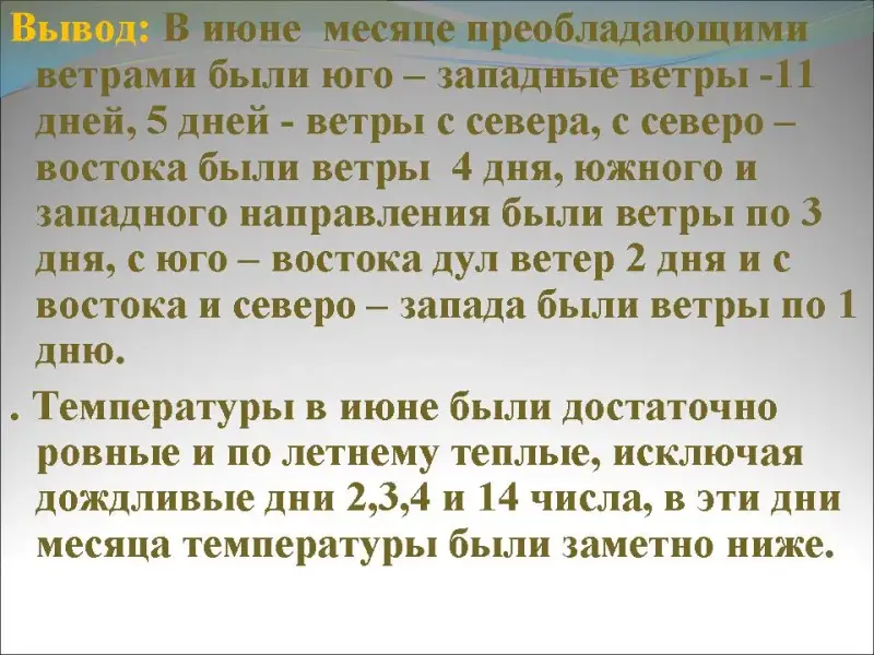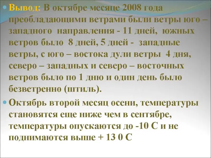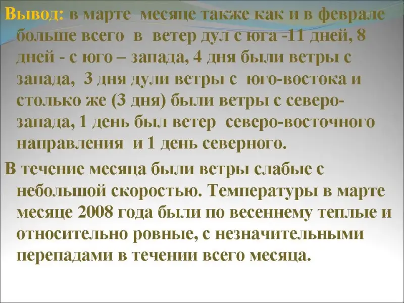 5. Оформите 3 слайда для общей презентации, по вашему месяцу (1 слайд - таблица данных дневника наблюдения, 2-й слайд - диаграмма «Роза ветров», 3 слайд - вывод), (Презентация, слайд 7-39)