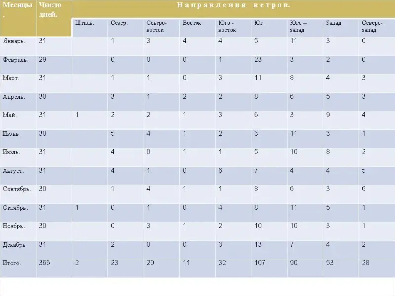 2. Постройте таблицу, используя данные дневников наблюдения (предварительно подсчитайте, ветры каких направлений были в течение месяца.)