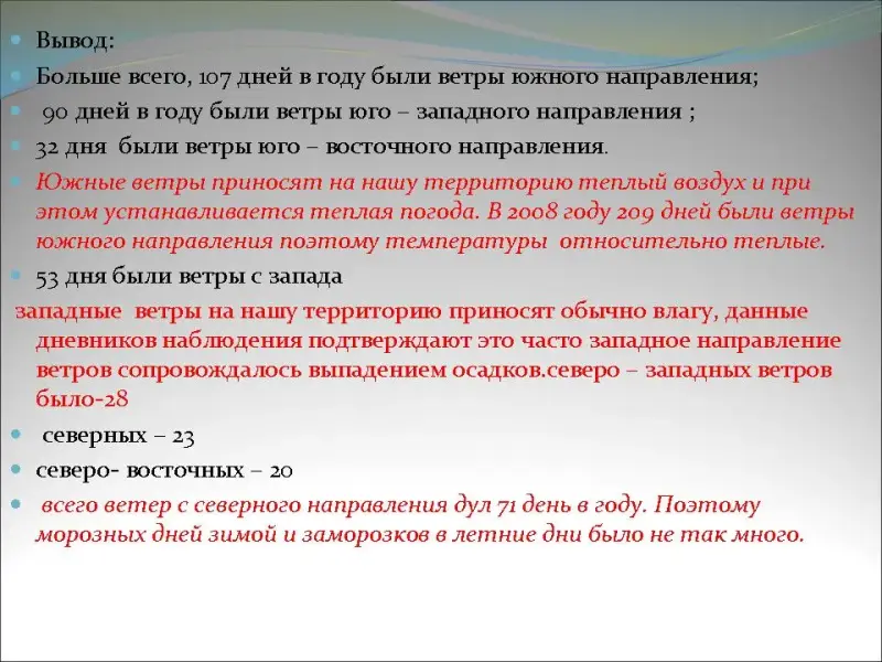Южные ветры приносят на нашу территорию теплый воздух, и при этом устанавливается теплая погода. В 2008 году 209 дней были ветры южного направления, поэтому температуры относительно теплые.