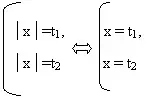 Решение. Применив метод - введения новой переменной, решим уравнение. Пусть: t = │х│, получим уравнение t2 - 3t + 1 = 0, имеющее два корня t1 и t2 (так как D>0). Очевидно, что корни t1 и t2 - положительны (t1 + t2 >0, t1 * t2 >0). Следовательно, по свойству модуля исходное уравнение, равносильно совокупности уравнений