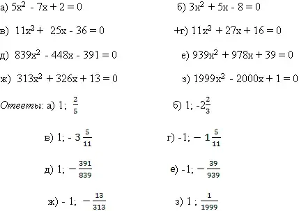 1) Если а + b + с = 0, то х1 = 1; х2 = ![]()