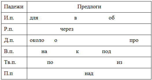 Продолжаем наш урок. Вы прекрасно знаете, что в русском языке существует такое понятие как "верные предлоги". Что это за предлоги? (Это предлоги, которые употребляются только с одним падежом. По "верному предлогу" легко определить падеж). Я составляла таблицу, и у меня произошел сбой программы, и все предлоги перепутались. Соберите их, пожалуйста, в систему.