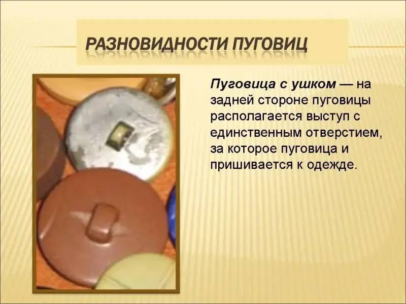 Пуговица с ушком - на задней стороне пуговицы располагается выступ с единственным отверстием, за которое пуговица и пришивается к одежде.