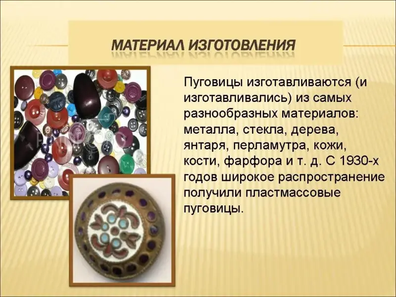 Бережливость и аккуратность во все времена и у всех народов считалась добродетелью человека - его большим достоинством. Для сохранения одежды в хорошем состоянии необходимо постоянно следить за ней - не только своевременно стирать, чистить и гладить, но и делать мелкий ремонт. А помогают нам в этом такие простые и привычные для нас инструменты как иголки, ножницы, напёрстки. Одним из простейших и распространённых видов ремонта является выбор и замена фурнитуры. Фурнитура - это вспомогательные изделия, которые используются в швейном производстве, а самым распространённым представителем является пуговица.