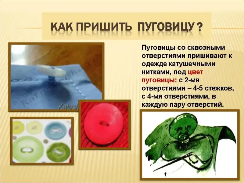 5. Каким способом прикрепляют пуговицы к изделию? "Способ пришивание"