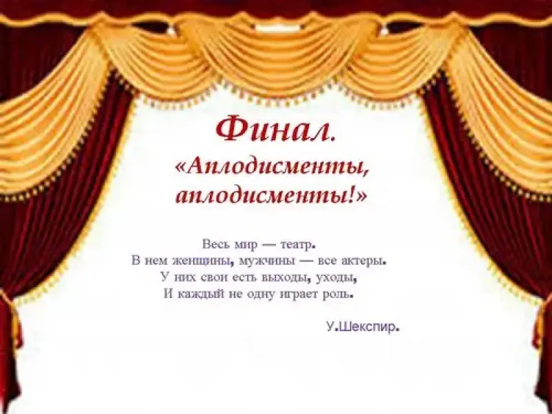 Сегодня мы с вами лишь приоткрыли завесу такого огромного, многообразного мира как театр. Театр нельзя не любить - он позволяет нам окунуться в мир прекрасного, являясь отражением нашей жизни, по сути- самой жизнью. И как сказал великий английский драматург Уильям Шекспир словами Жака из комедии "Как вам это понравится"
