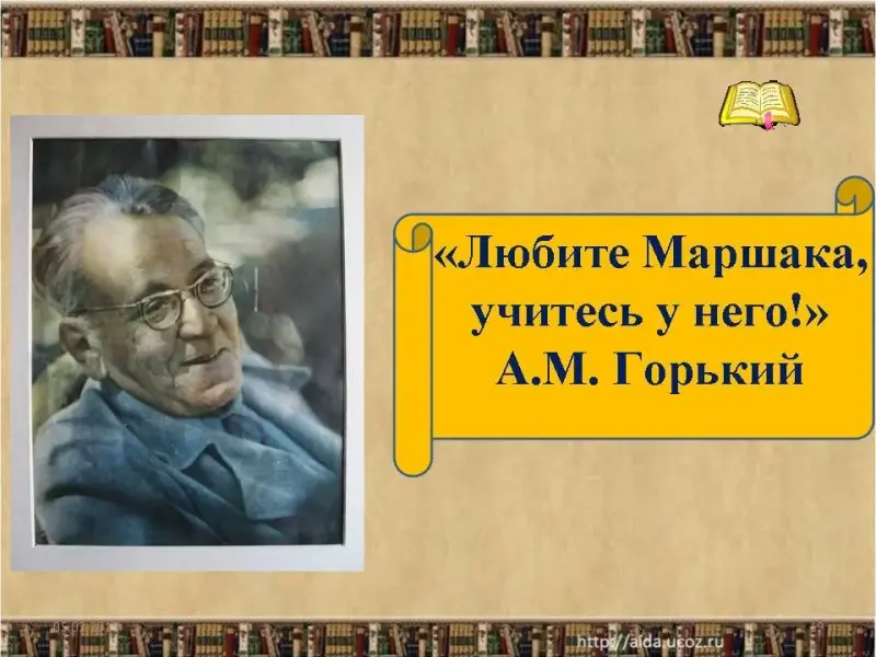 (Кнопкой мышки перелистываем фотографии Маршака на 2 слайде)