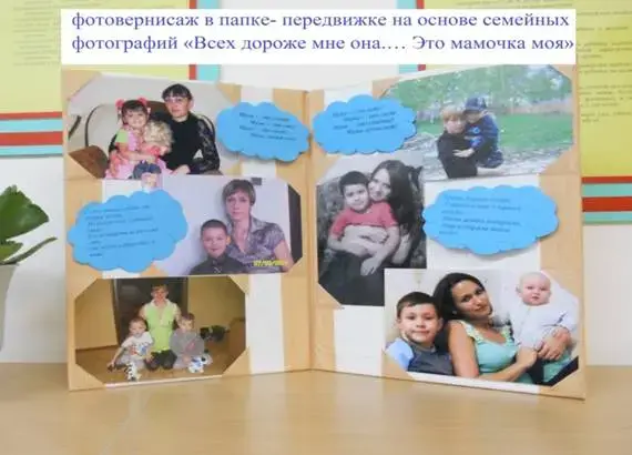 - оформление фотовернисажа в папке-передвижке на основе семейных фотографий «Всех дороже мне она.… Это мамочка моя»;