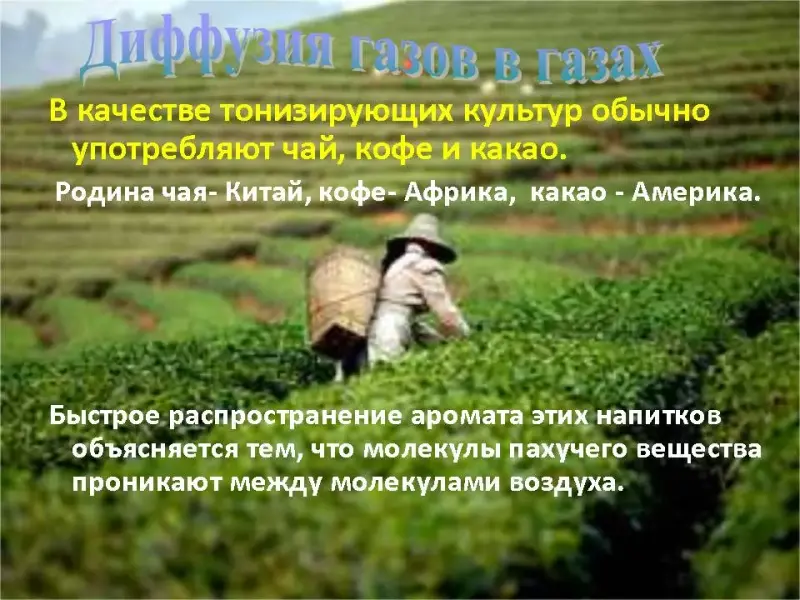Кто из нас не пил чай, кофе или какао? Обычно они используются в качестве тонизирующих культур. Родина чая - Китай (в Европе он стал известен только в XVII веке), кофе - Африка, а какао - Америка. А знаете ли вы, чем можно объяснить аромат этих напитков? Это явление объясняется диффузией. Молекулы пахнущего вещества этих напитков проникают между молекулами воздуха.
