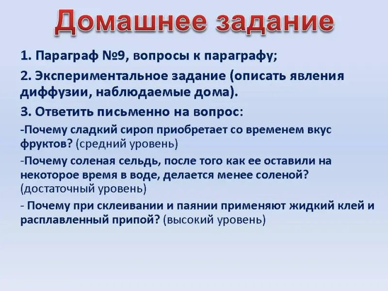 - Экспериментальное задание (описать явления диффузии, наблюдаемые дома).